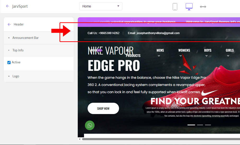 Top Info | Activate the top info header it will show your contact number, email and social media accounts.