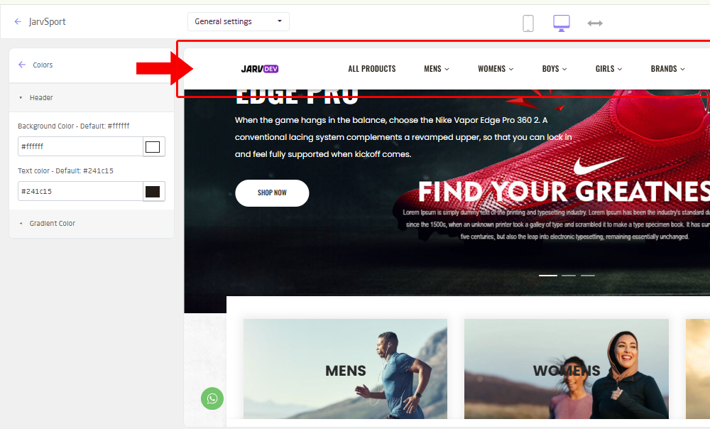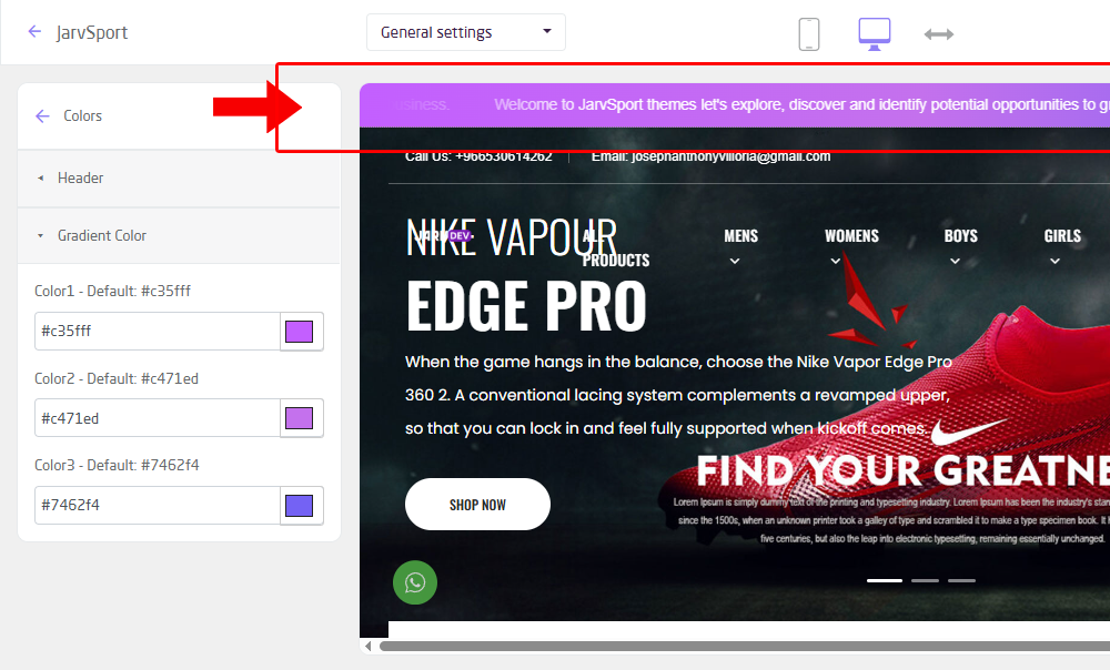 Colors > Gradient Color | Change the gradient color for announcement bar, hover button and some other part of the themes.